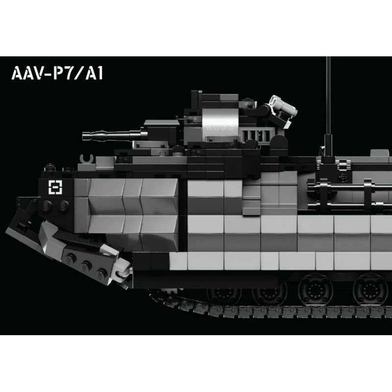 Loaded with brick-built camo, custom printing, and a crew of three custom minifigs, the AAVP7A1 includes play features such as opening top and rear hatches, rotating turret with elevating guns, a swiveling front plate, and room for up to 8 minifigs in the main compartment. All details are custom printed, this kit features zero stickers.