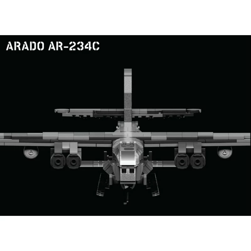 This kit includes both the Arado Ar-234C and Arado E381 builds as well as a custom minifig. There’s also the option and bricks to build earlier single engines that can be swapped out with the late twin-engine mounts. Both the single engine and twin-engines can be built at the same time. Both models feature custom printed Balkenkreuzes and many other details. Play features include working landing gear, detailed cockpit, and of course the deployable (and highly swooshable) Arado E381 build. Featured stickers include Balkenkreuzes for the sides of the Ar-234C as well as the canopy.