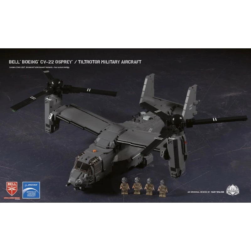 This highly detailed and carefully designed Brickmania kit features several of the key components of the Bell™ Boeing™ CV-22 Osprey™. Rotating nacelles on each end of the wing house the signature rotors that rotate in tandem in opposite directions, just like the real Osprey®. The entire wing and rotor apparatus collapses for carrier stowage. The model also features moveable flaperons, rudders, and elevators, along with retractable landing gear. Four crew minifigures, custom-printed elements, and a high-quality sticker sheet are also featured with the kit.