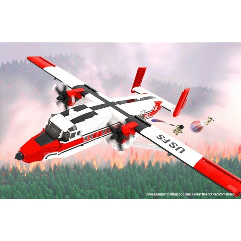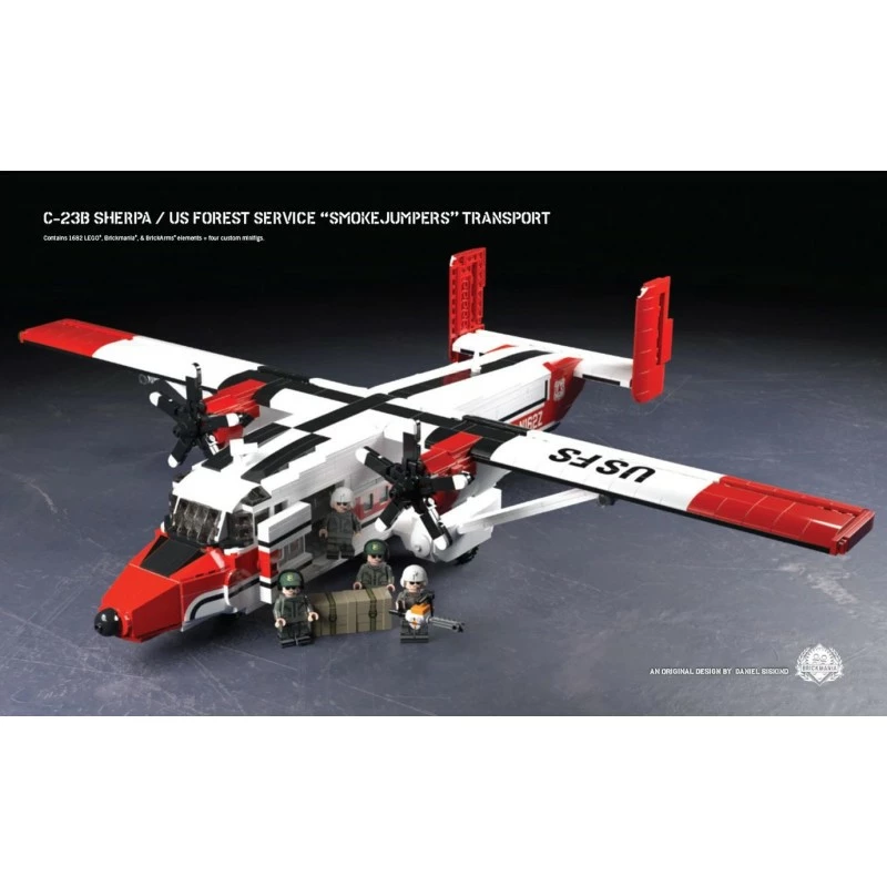 In one of the most unique undertakings by Brickmania, the C-23B Sherpa kit sports the colors of the Missoula Smokejumper Base at the Aerial Fire Depot in Missoula, Montana. This highly detailed model includes over 40 custom printed elements including a crew of four minifigs with custom created USFS hats with headphones. Play features include spinning props, posable rudders, elevators, and ailerons, opening doors, as well as a detailed interior and cockpit. The build’s design allows easy access to the fuselage for added playability and includes a brick-built display stand. Note that the minifigures with the C-23B Sherpa are crew members not Smokejumpers, but Smokejumper minifigures are available as an additional purchase.