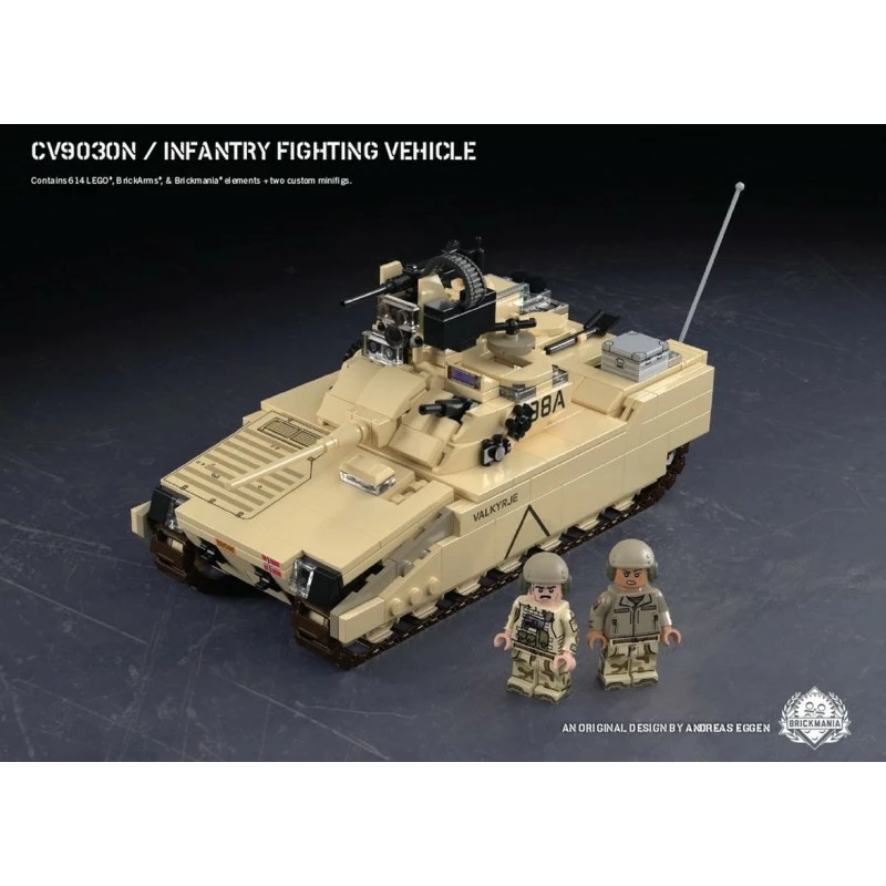 This is the IFV of the future! Loaded with custom printed elements and no stickers, plus two custom minifigs the CV9030N model features everything desired in a tracked Brickmania model. The interior includes space for extra minifigs, along with opening top hatches and a rear door. The turret elevates and traverses as expected, and the build itself is playable and durable.