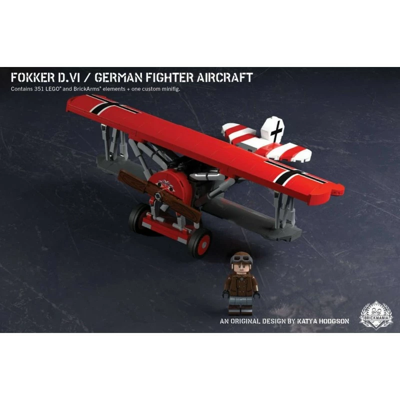 Sturdy, colorful, and bursting with personality, the Fokker D.VI kit is another addition to Brickmania’s WWI aircraft collection! The kit includes custom printed balkenkruez on the top of each wing and on each side, woodgrain propellers, engine details, a unique face on the front of the craft, and one custom minifig. Additional details are included in a high-quality sticker sheet.