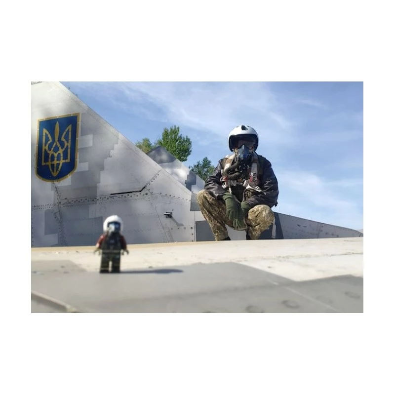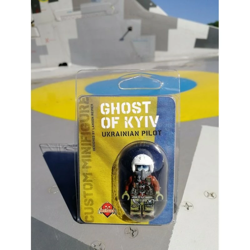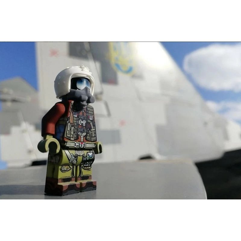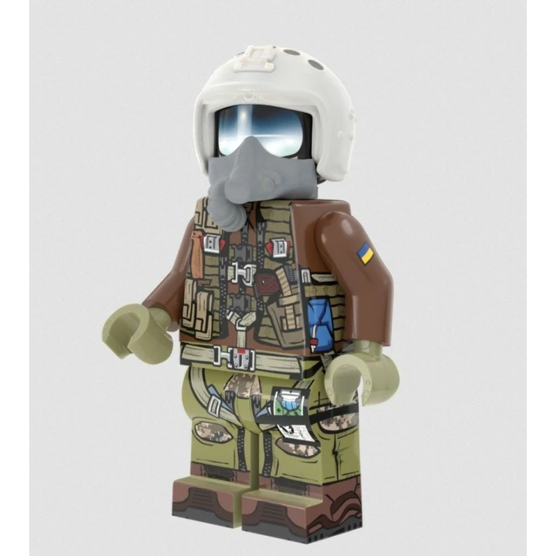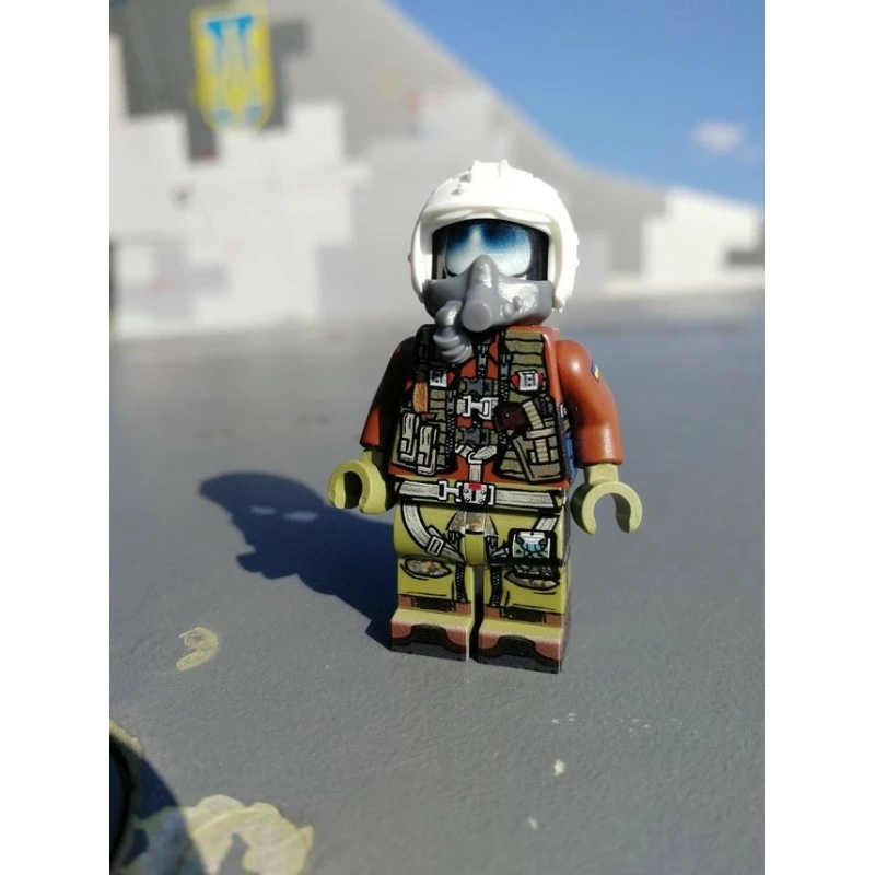 This minifig is a tribute to the brave pilots that continually risk their lives for defense of freedom in Ukraine. The figure represents a Ukrainian pilot during the first week of the war and was designed by Lando in consultation with Ukrainian MiG-29 pilots currently on the front lines. The figure features modeled elements, and extremely detailed printing, all designed and manufactured at Brickmania HQ.