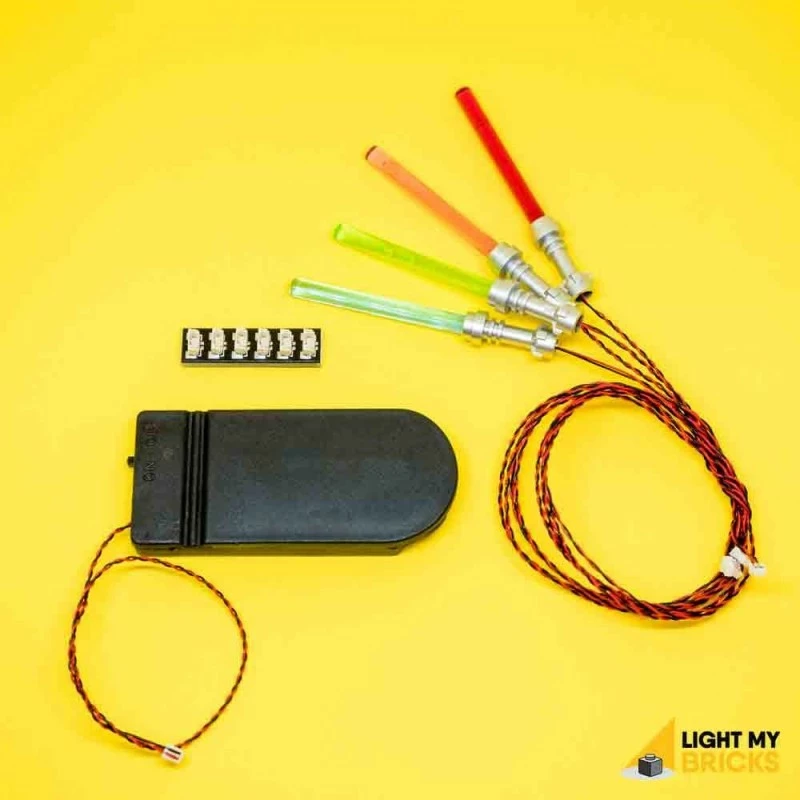 Deze kit bevat een voorgemonteerd paars, groen, rood en blauw lichtzwaard, evenals een uitbreidingskaart en batterijpakket.