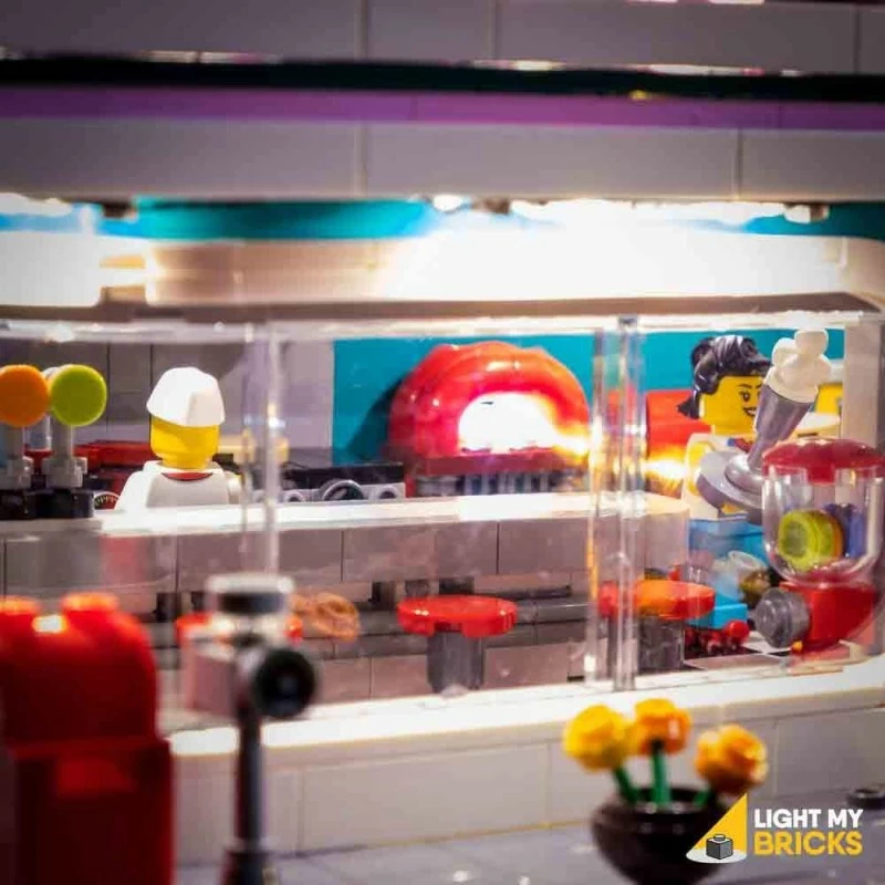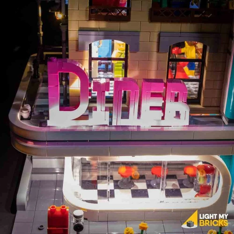 Onze op maat gemaakte, eenvoudig te installeren LEGO lichtset bevat 32 individuele lichten om het beste uit deze dynamische set te halen. Onze LEGO LED-lichten zijn toegevoegd aan gebieden zoals het “DINER” -teken, interne Diner-lichten op de benedenverdieping, flitsende effecten voor de muziekjukebox om de muziek na te bootsen die wordt gespeeld, onze kenmerkende LEGO-straatverlichting (lantaarnpaal), bovenverdiepingen, individuele verlichting voor de auto in roze Cadillac-stijl en knipperlicht voor het radiobaken.