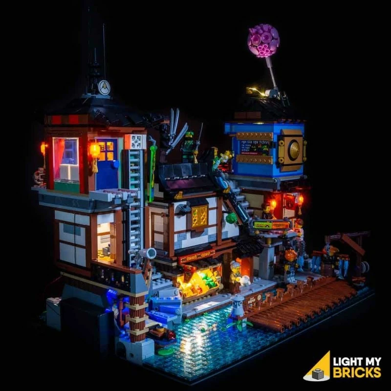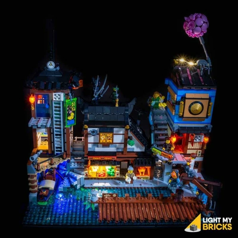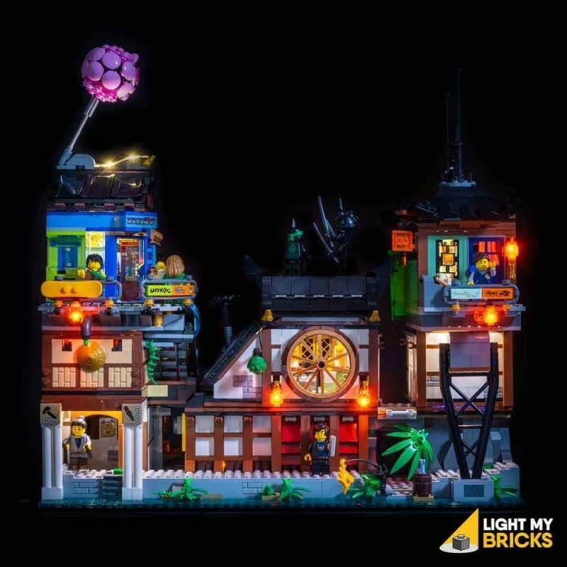 Er zijn een aantal geweldige verlichtingsfuncties voor deze set, waaronder verlichting voor de binnenkamers en de dojo, verlichting voor alle hangende straatlantaarns, verlichting voor de rotisserie-kippenstand met flikkeringseffecten die op een vuur lijken. Deze lichtset is ook ontworpen om compatibel te zijn met onze Ninjago City lichtset!