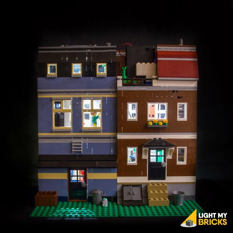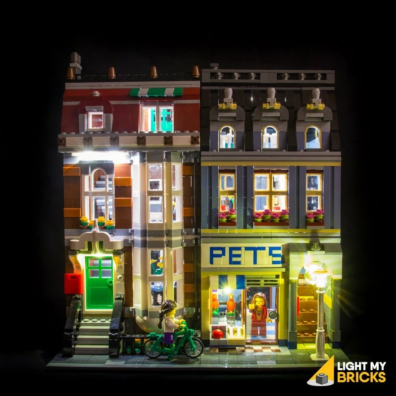 De dierenwinkel is waar alle dierenliefhebbers samen komen. Als voortzetting van de LEGO® Modular Buildings-serie, is dit zeer gedetailleerde, drie verdiepingen tellende gebouw en herenhuis nu beschikbaar als een Light My Bricks LEGO® verlichtingsset.