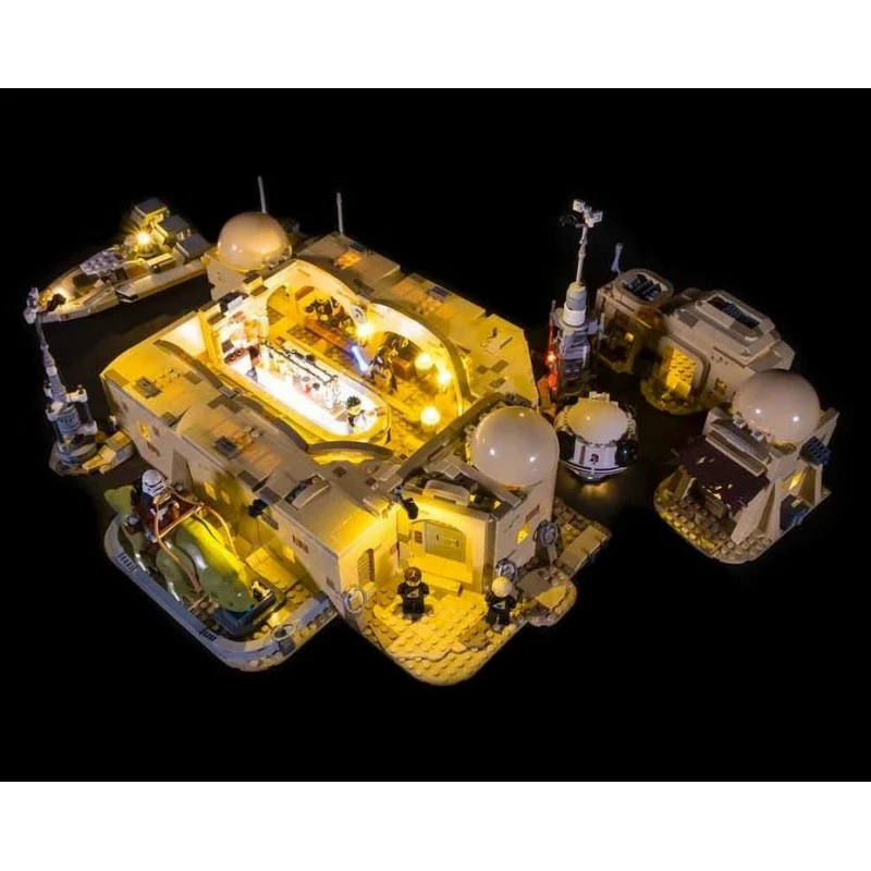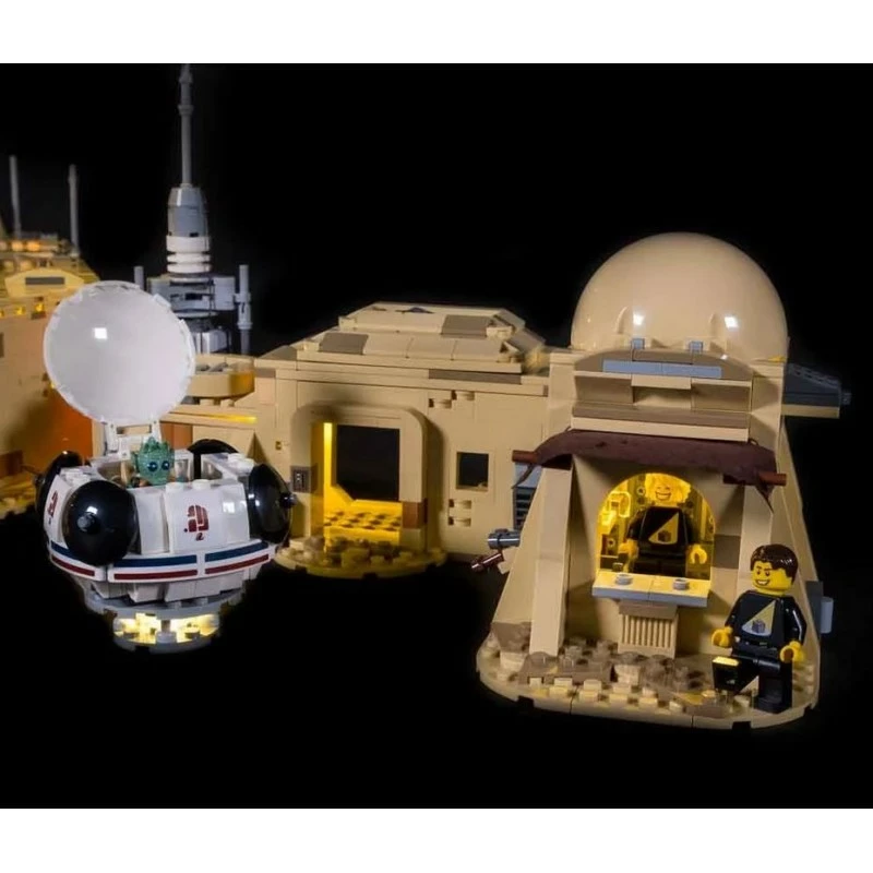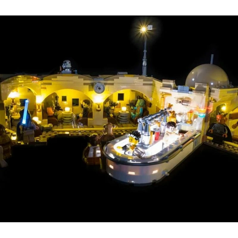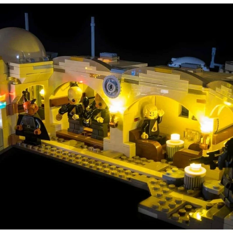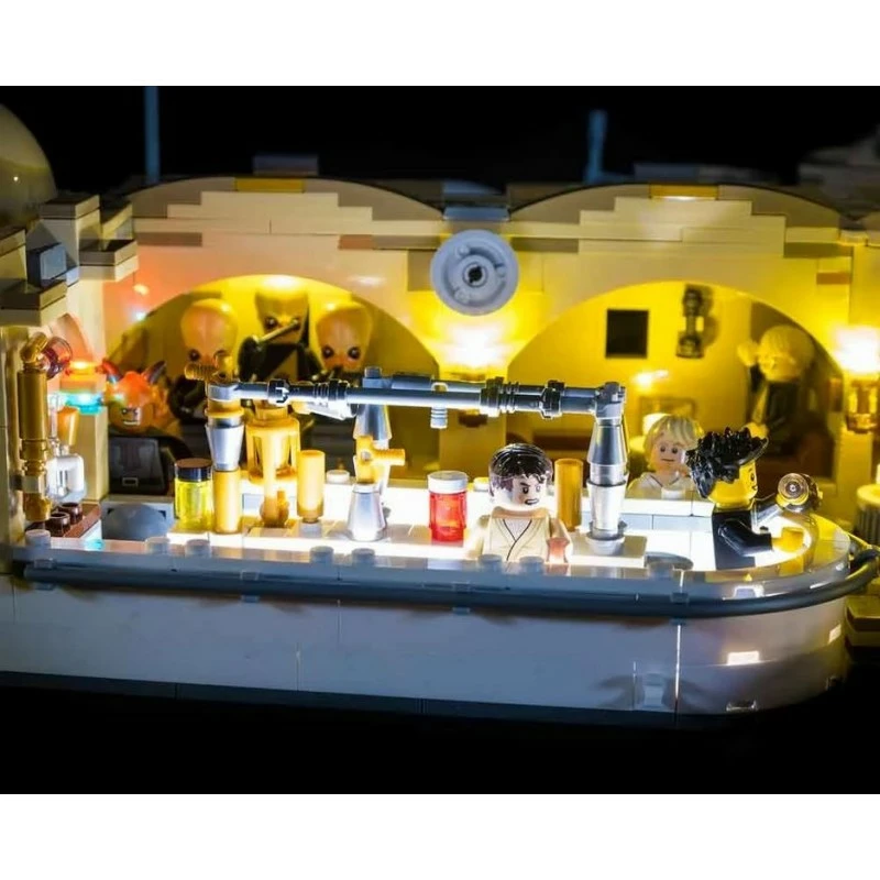 Deze lichtset wordt geleverd met 35 individuele lampen, met warme verlichting voor cabines, stripverlichting voor de bar, een lichtzwaardlicht voor de scène van Obi-wan en lichteffecten om Han’s ontmoeting met Greedo na te bootsen (Han eerst geschoten!).