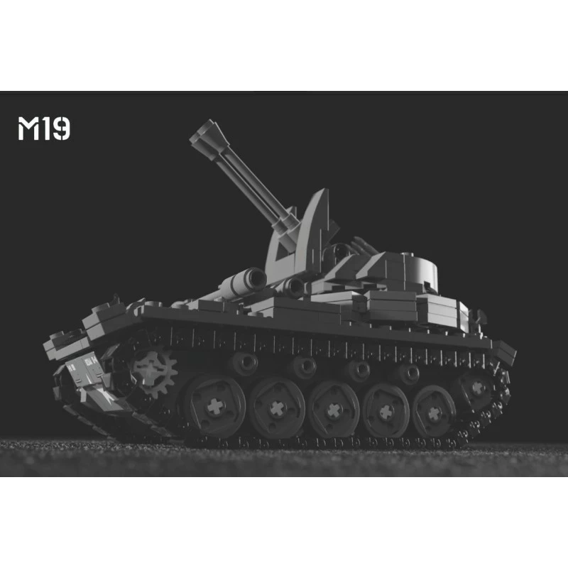 First entering the front lines in April of 1945, the M19 – Multiple Gun Motor Carriage was a tracked antiaircraft gun based on the chassis of the M24 Chaffee light tank. The chassis of the M24 was lengthened slightly, and the motor was relocated to just behind the driver. This rearrangement created room for the main gun. As for armament, the M19 sported dual mounted 40mm M2 automatic guns (built by Bofors) that sat on on a 360 degree rotating turret. The M19 required six crew members to operate it properly—a driver and assistant driver, two gunners, and two loaders. Running at optimum levels, the M19 could discharge 120 rounds per minute. The 40mm guns were fed via 4-round clips dropped into an automatic loader. Running the gun smoothly required every member of the crew to do their job in a well orchestrated manner. The M19 carried 352 total pieces of ammunition, and an M20 trailer, towed by the M19, could carry an additional 320 rounds.