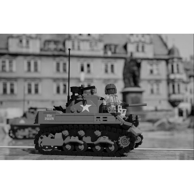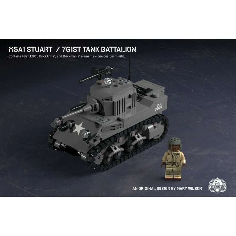 This epic build for February 2022’s Black Heritage theme features a custom 761st tanker minifig with a new 3D printed tanker helmet and all printed kit details, including turret stars, unit markings, gears, front hatches, and more. Play features include a rotating turret, opening top hatch, and turret mounted BrickArms.