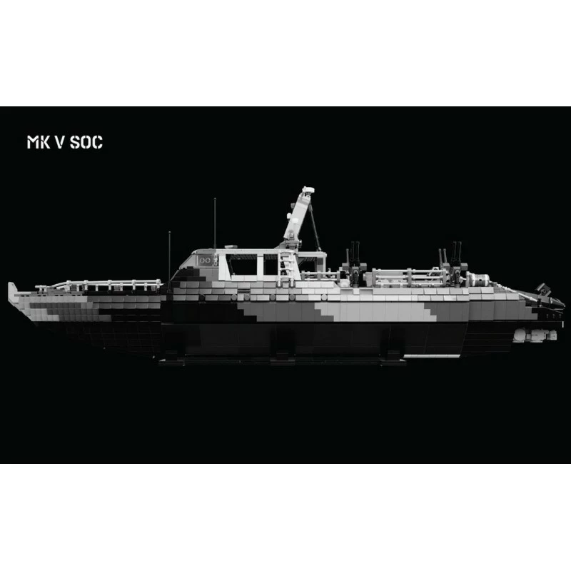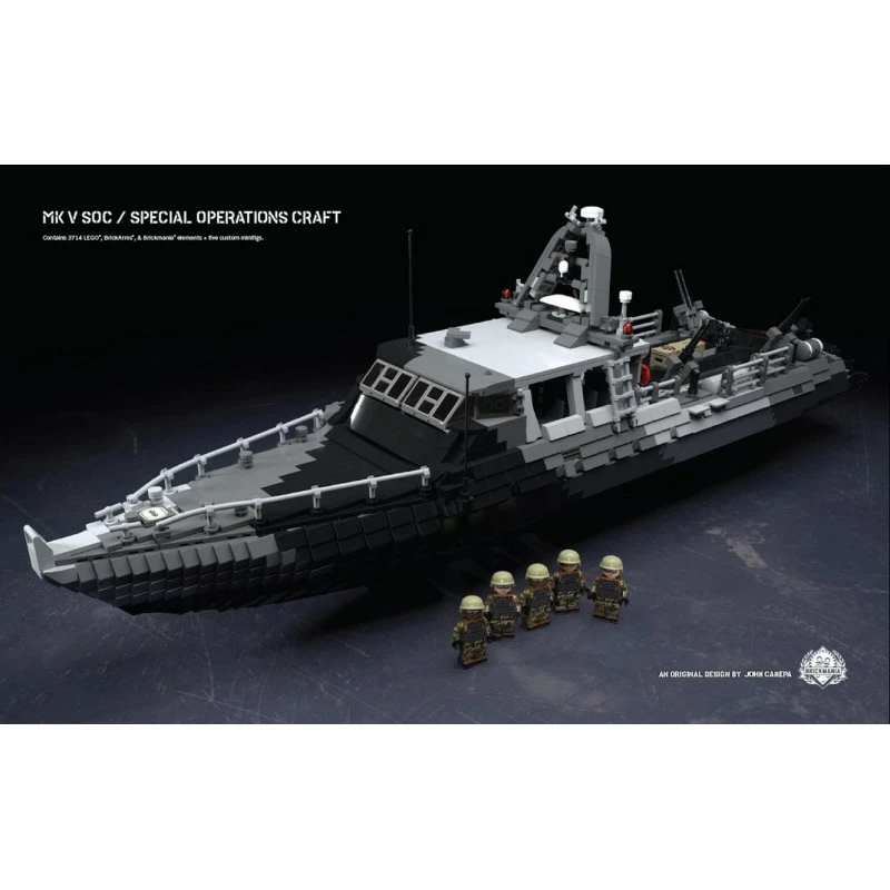 Fully detailed inside and out, the MK V SOC build is nothing short of a modern PT-109 level Brickmania kit. The crew is made up of 5 custom Special Warfare Combatant-Craft Crewmen (SWCC) minifigs, and the build features a ton of custom printing/artwork including life preservers, control room displays, US flag, mission plans, handprint reader for weapons locker, hatch details, crates, and more. Play features include 2x custom built rafts, various BrickArms®, rotating top sensor, 2x rotating pilot chairs, seats for 10 Navy SEALs, detailed brick-built engines, forward bow compartment, beds, tables, kitchen burners, cabinets, weapons locker, a bathroom, and more. Additionally, the bottom can be removed for waterline MOCs.