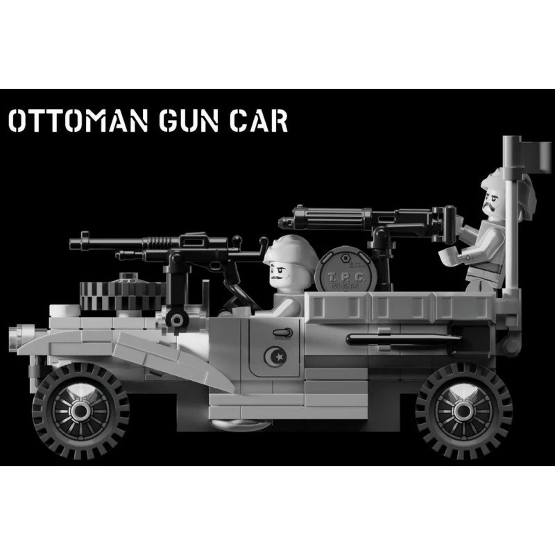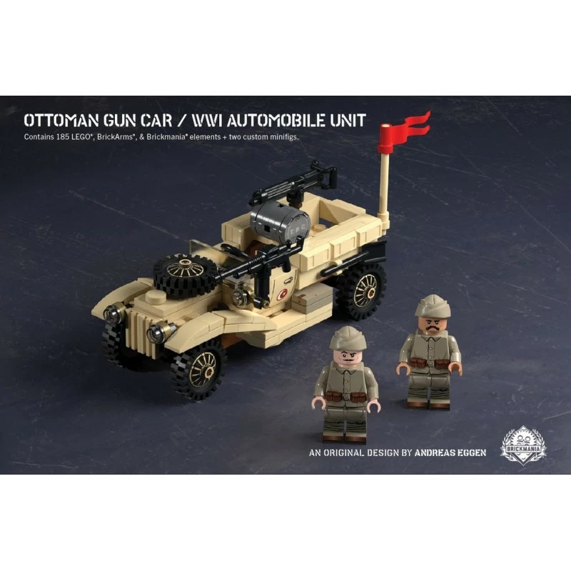 From printed elements to a custom crew, the Ottoman Gun Car kit has it all! The build features no stickers, all details are printed and include door markings, oil drum, ammo cans, wheel spokes, and more. Also featured are a pair of custom minifigs with original artwork and 3D printed kabalak hats and a pair of mounted BrickArms® machine guns.