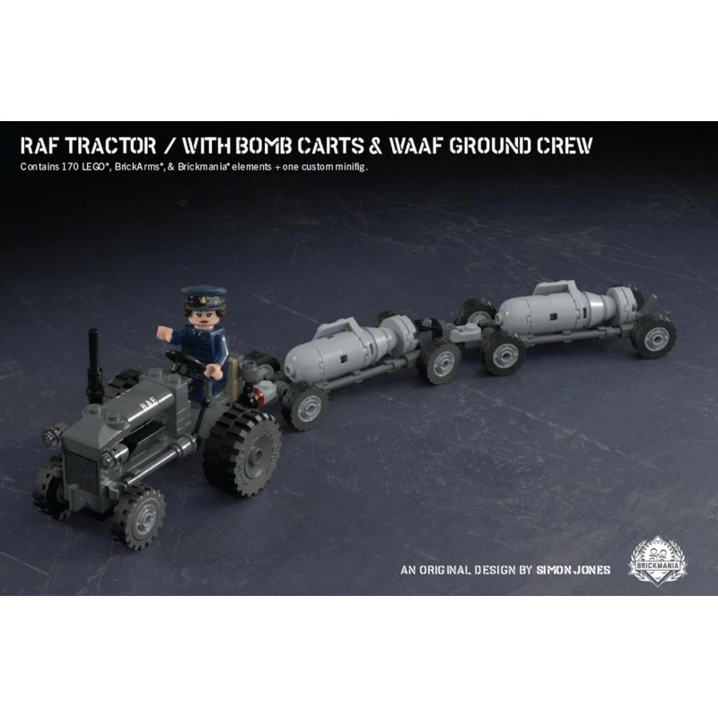 Complete with two bomb carts (with brick-built bombs) and a custom WAAF minifig, this awesome kit features fully printed details, and no stickers. The tractor and bomb carts easily connect/disconnect, and the WAAF ground crewman minifig features a custom 3D and UV printed cap and hair piece.
