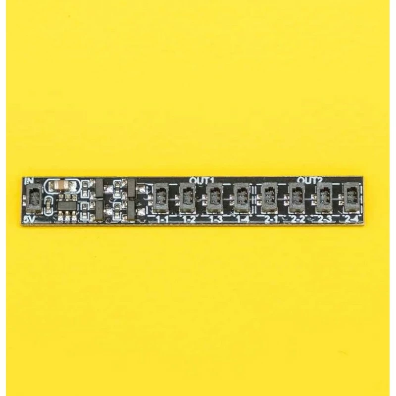 Fysieke afmetingen zijn 49 mm breed x 7 mm lang. Het bevat 4 uitgangskanalen per reeks, waardoor u in totaal 8 uitgangspoorten en 1 ingangspoort heeft.