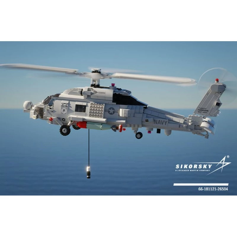 This incredible build features all custom printed details with the option to customize your kit’s squadron. Play features include 2x winches; one for crew/cargo, the other for sonar, as well as opening side/pilot doors, spinning rotors, and the ability to fold up for storage. The crew of 4x custom minifigs with custom-created headgear includes 2x pilots, 1x operator, and 1x door gunner.