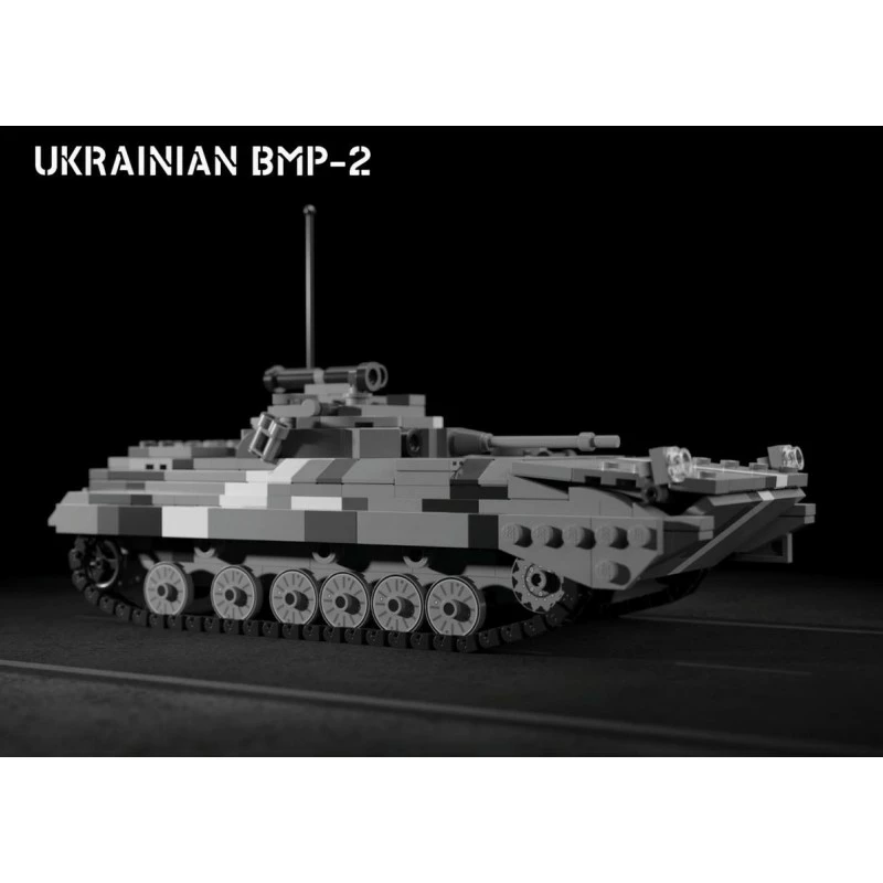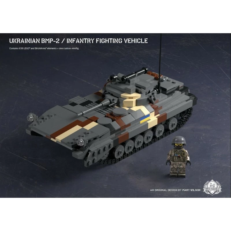 The BMP-2 features opening hatches and interior access for crew and passengers, fully rotating turret with posable main gun, and Brickmania custom track links.