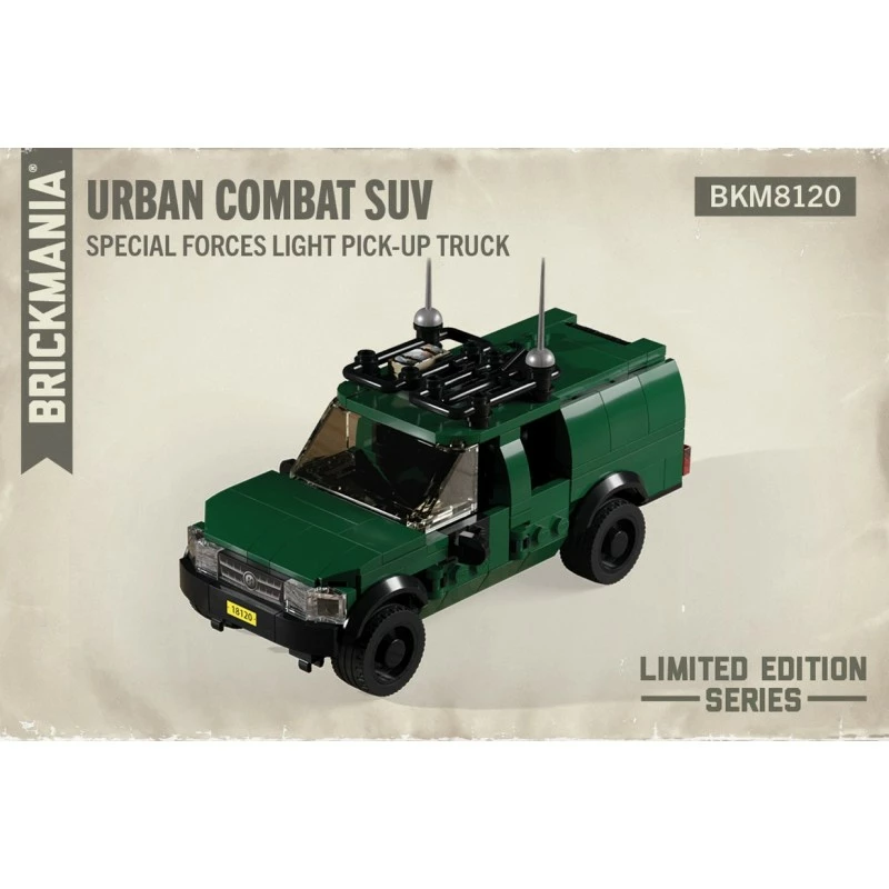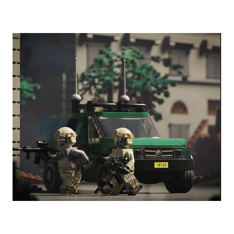 Crewed by 2x custom minifigs and featuring all custom printed details, this limited-edition kit fits perfectly into any special forces collection or MOC. Play features include functional side doors, space for 4x minifigures, roof rack, functional double folding rear door, and weapons rack. NOTE: No BrickArms® are included with this build.