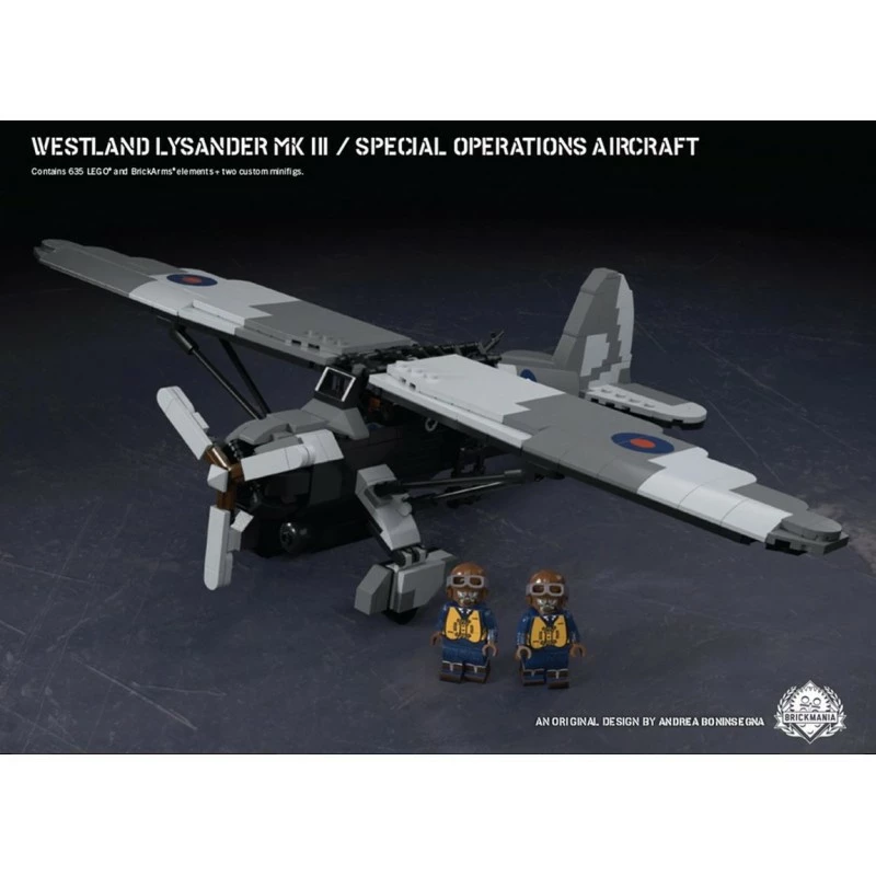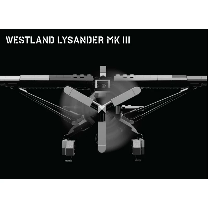 Sturdy, swooshable, and ready for the night, the Westland Lysander Mk III kit represents an iconic piece of WWII special operations history. Complete with 2x custom minfigs, brick-built drop tank, and 1x BrickArms® Lewis Gun mounted at the rear of the cockpit, the Mk III build accurately captures the iconic wing shape, and features details such as the permanent ladder, spinning prop, and opening ‘greenhouse’ canopy. Printed details include roundels on the sides and wings. No stickers!